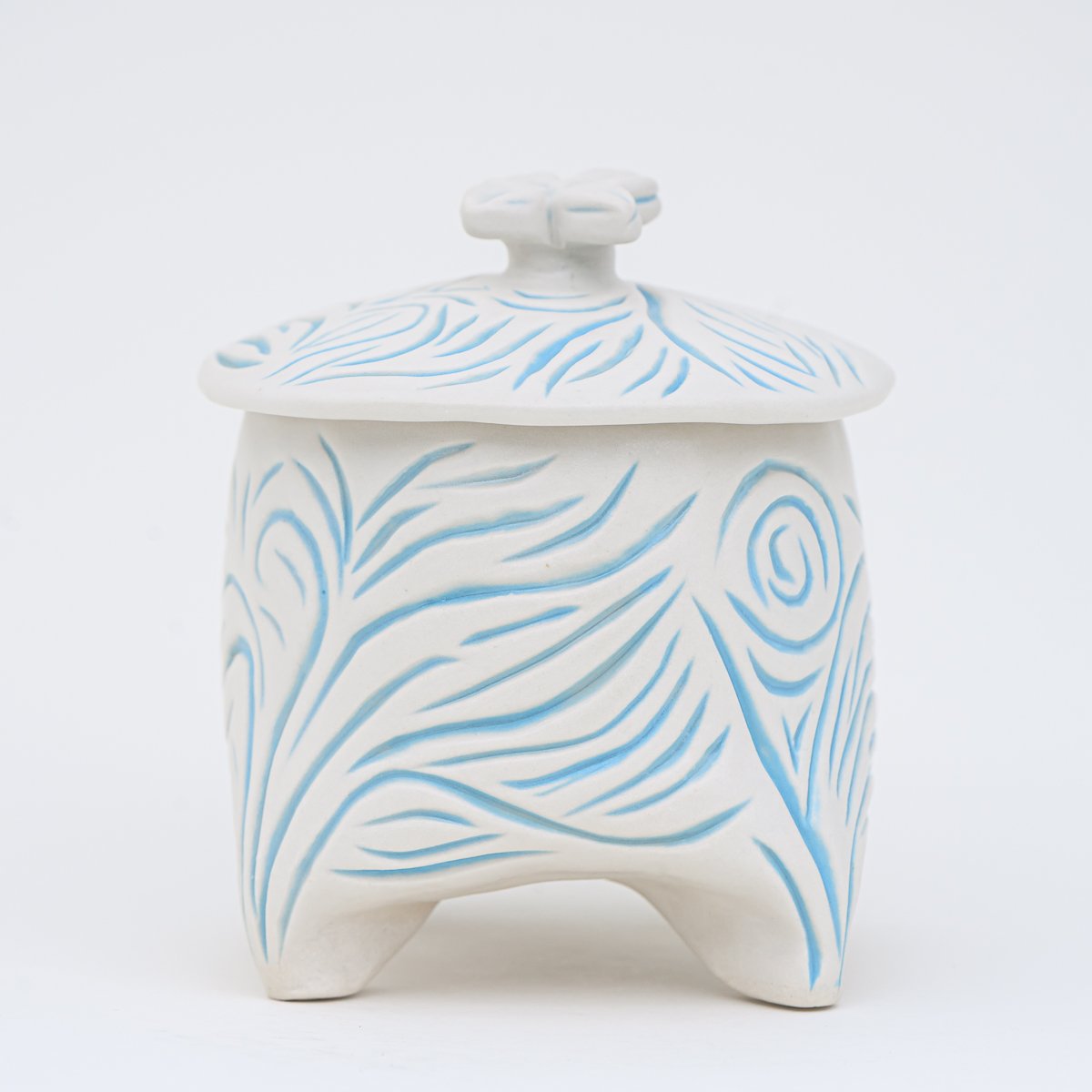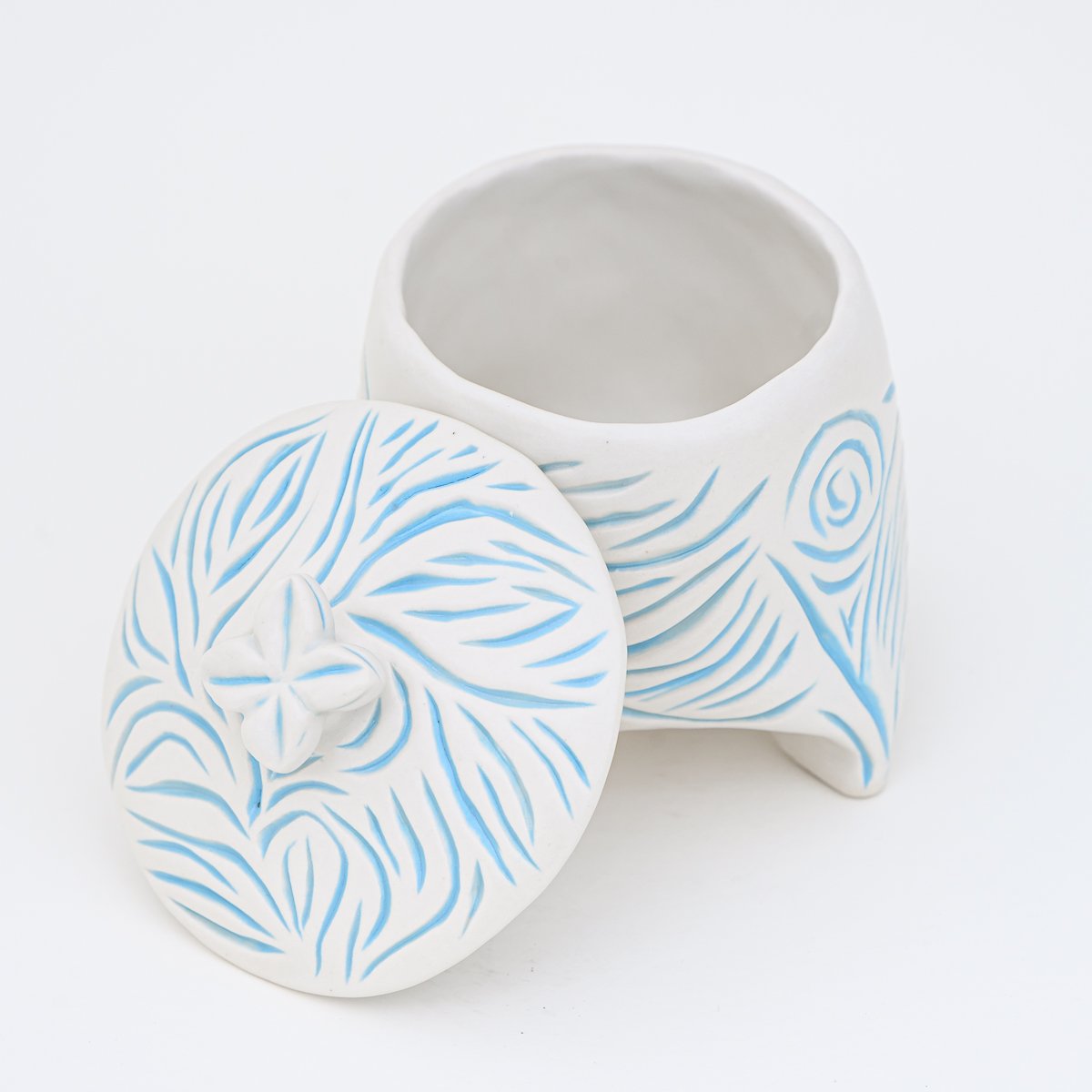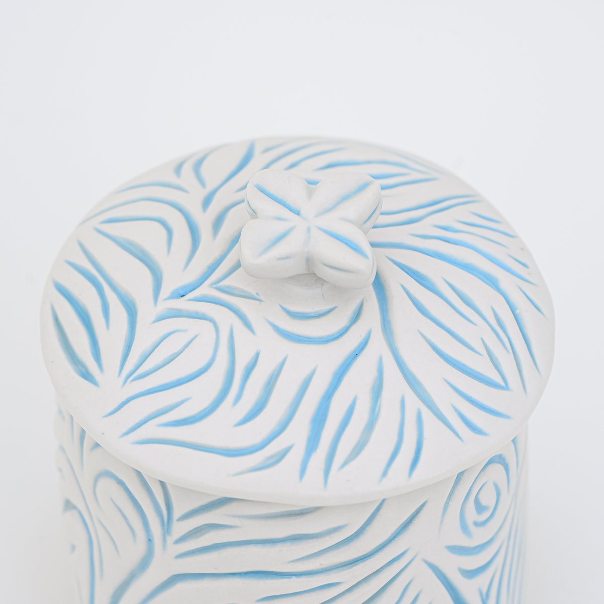 Blue and white satin matte jar with lid. Organic carved design.