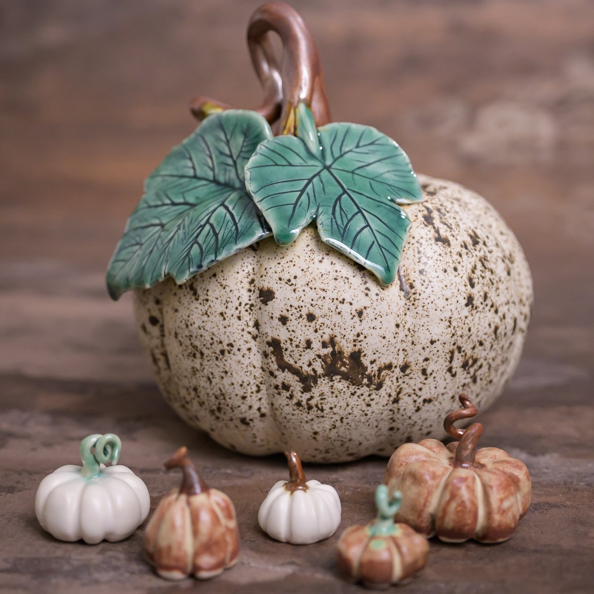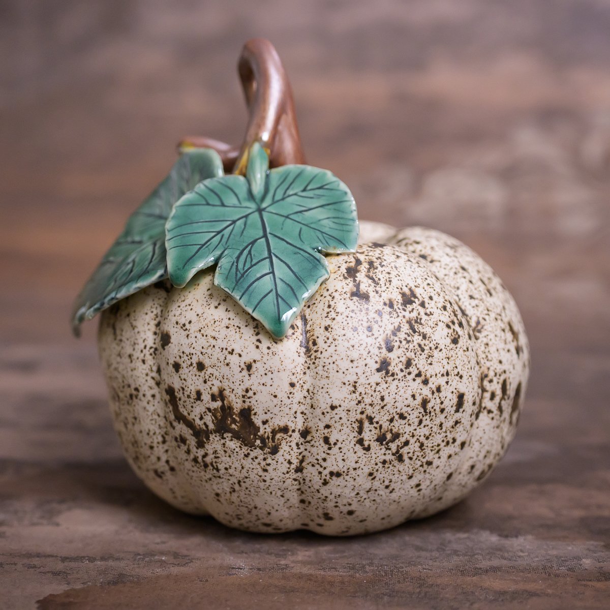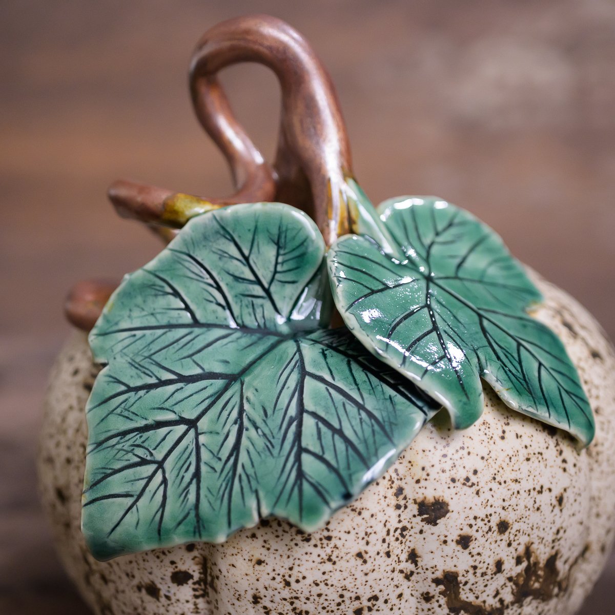 Winter wood glazed pinch pot pumpkin with jade green leaves and copper stem. Sold at ArtiGras 2024